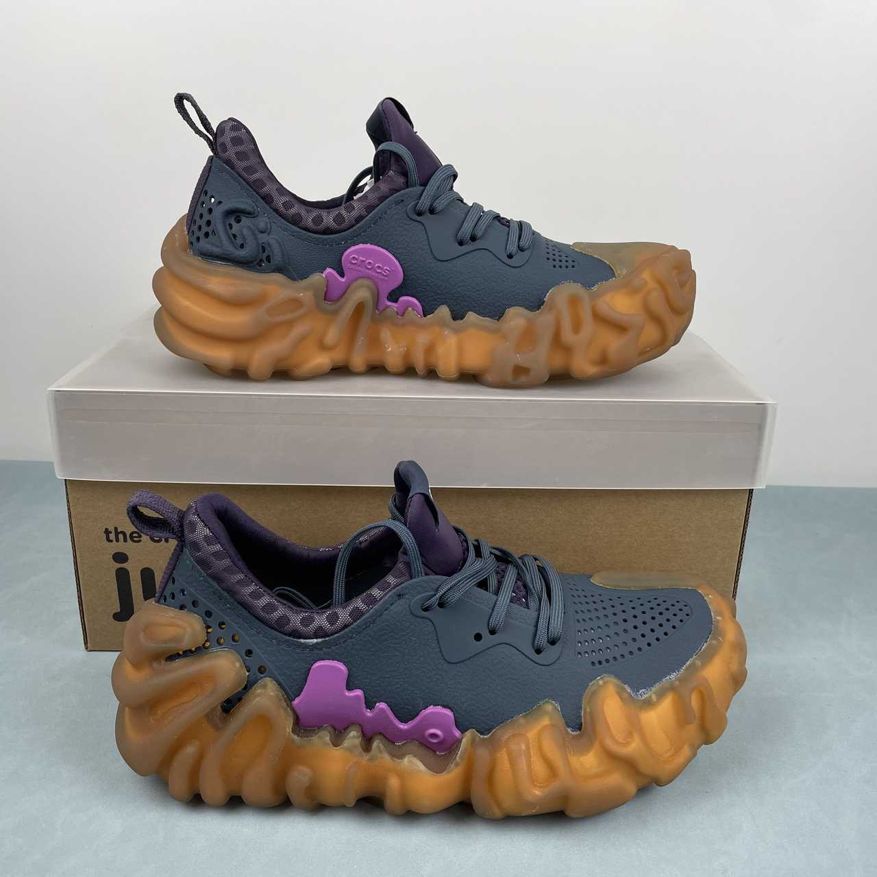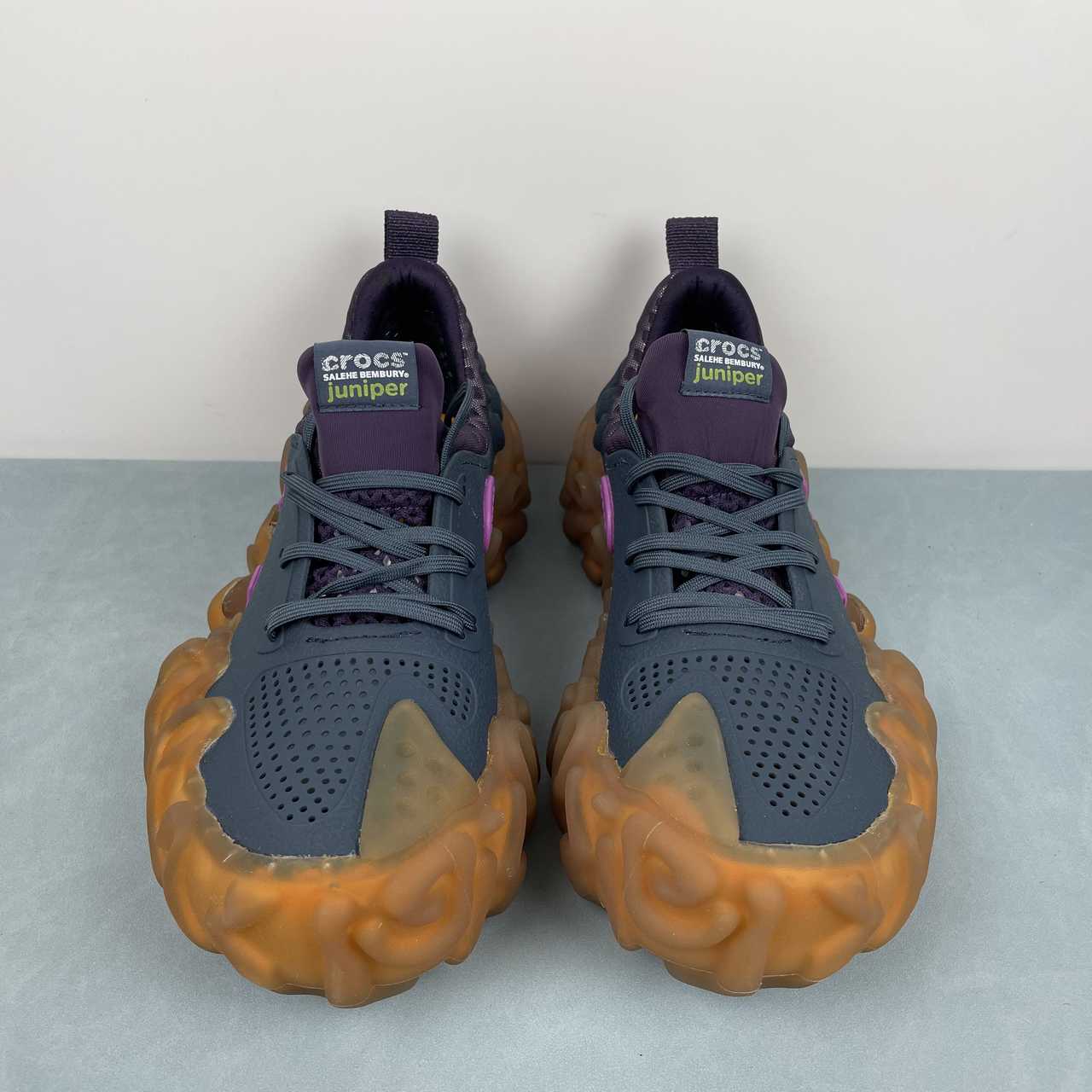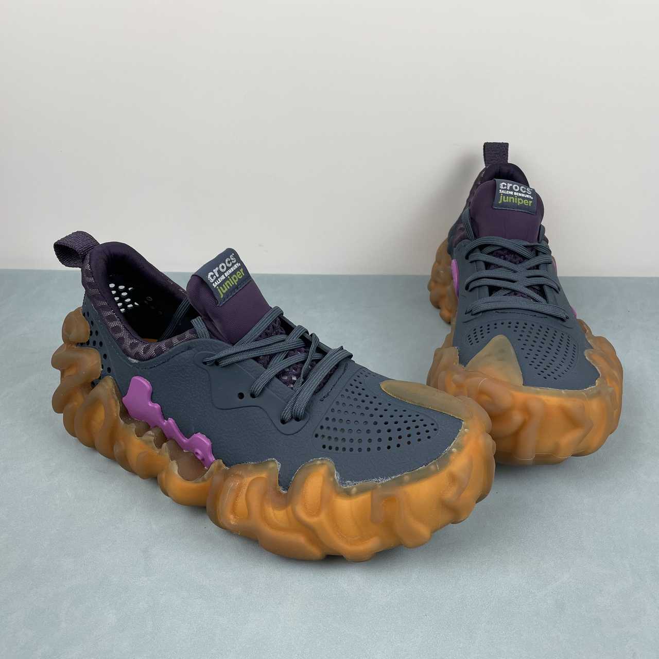 Este novo design destaca-se pelo toque característico de Salehe, explorando cabedais inusitados e cores vibrantes. O Juniper Crocs mantém a essência dos tênis clássicos, incorporando dedos perfurados, um sistema de cadarços de seis ilhós e uma bota interior à base de malha. No entanto, sua identidade única se destaca através da sola de borracha translúcida e da exclusiva tração de impressão digital.
